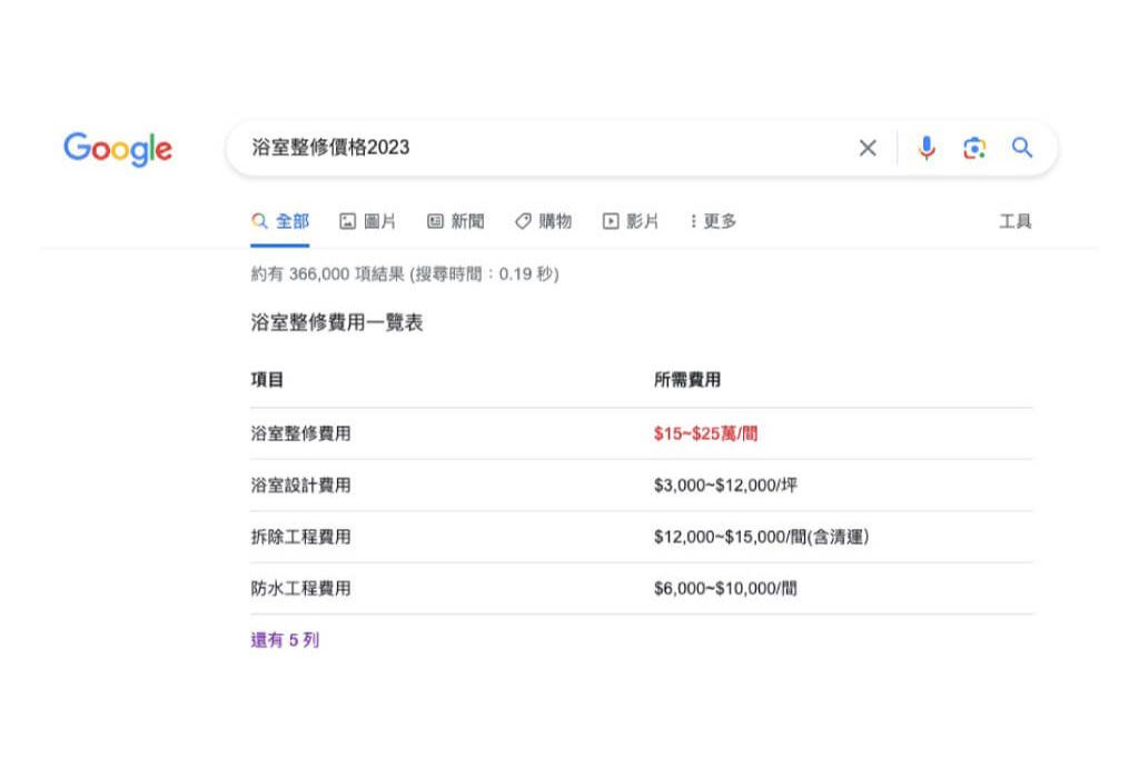 如果還是不知道現在整修1間浴室要準備多少預算,就可以求助網路大數據:例如Google搜尋『浴室整修價格2023』就能產生一些浴室整修價格的資訊(如下圖),也可以提供給消費者一些數據參考