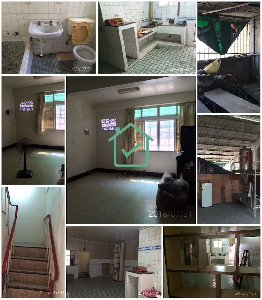 整修需求:拆除、運棄、水電、門扇、鋁窗、泥作、6層防水(含防水保護)、磁磚、衛浴、天花板、廚具、鐵材、油漆